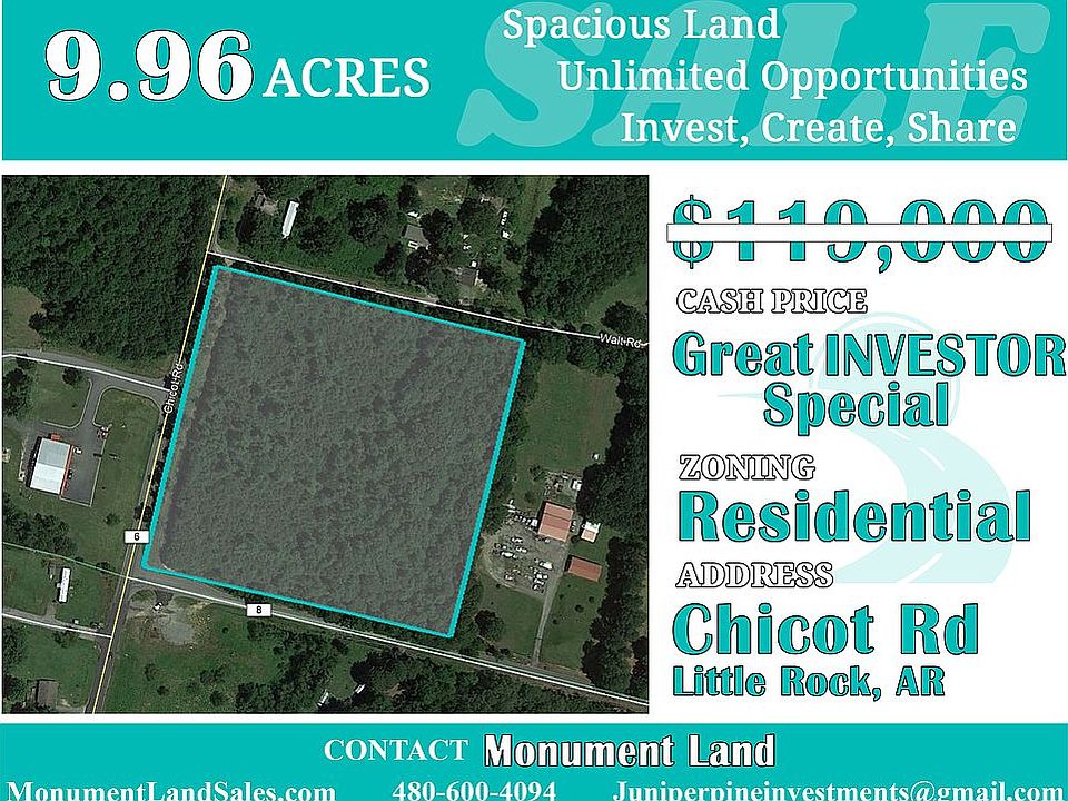 UNZONED 9.96ac Great Investor Special Contact Monument Land to learn more UNZONED 9.96ac Great Investor Special AMAZING, Easy Access, Multi-Functional Lot **************************** Contact Monument Land to learn more: 480-818-5604 VM- Juniperpineinvestments@gmail.com **************************** Are you in search of land that could serve a multitude of usages? Look no further as you’ve discovered the lot of your search! Arkansas is one of the most affordable states to live in. The economy is strong & diverse with numerous job opportunities. And this Unzoned property is Overflowing with Potential! Create a commercial Corner for a Convenience store, Car lot or light industrial work. Or if you’re looking to move to the area this city is Quiet, Family oriented & just Beautiful to live in! You could even bring extended family as the land allows Multi-family & several Single family homes to be built on the property. There are Lots of Amenities nearby from Great Southern Comfort foods & shopping to everyday life needs. Buy these 9.96 acres Today, as it will be a Fantastic investment for yourself & your Dreams! Take a drive down the paved Chicot to visit the parcel. You can use these coordinates to find the property via Google maps: 34.626885, -92.363213 or the neighbors address of 13421 Chicot Rd, which is across the street from the lot. If you’re interested in the commercial options for this land, Chicot Road Average Daily Traffic is 6,800. And a variety of Convenience stores are already nearby, like the Mabelvale Wine & Spirits. Plus these 9.96 acres can also support 9 houses as each acre can house 1 home with set backs. Electricity & Water are accessible on the street. Buyer will have to set up a private septic system. Buyer must verify with County to know what can & can't be done with the land, obtain proper permits if needed & confirm the availability of any utilities needed/serviced on the lots. Seller makes no warranties or representations about the land, its condition, or what can be built on the parcel Little Rock is truly a Great place to live. There are many Activities to participate in from Farmers markets, to spending the day Downtown in the River Market District, shopping & dining at Amazing restaurants, to escaping to the outdoors with a Hike through Pinnacle mountain! Pinnacle Mountain is a Beautiful place with a variety of easy to challenging trails. There's also Picnic Areas, a Playground, Water Fountains & more! Plus the Big Dam Bridge is another Picturesque site that is a favored location for Family walks. Residents really get the BEST of both worlds! Awesome Big City conveniences, while still being surrounded by thriving Natural scenery. This land is also only 42 minutes to Pine Bluff & 51 minutes to Hot Springs. Purchasing property from us is quick & effortless. This property will be closed by a local title company & is guaranteed to be free of all liens and encumbrances. Buyer will receive title insurance & warranty deed. Message us here/call us today to get started. Buy this lot today for just $109,000.00 OBO Property Details: Lot Type - Land Sale Price - $109,000.00 State - Arkansas County - Pulaski Assessor's Parcel Number - 45R-013-00-028-00 Property Usage - Unzoned, Residential & Commercial Usage Options Property Address - 0 Chicot Rd, Lot #: 0, Little Rock AR, 72209 Size - 9.96 Acre(s) Road Access - Yes, Paved Electricity - At the Street Water - City Septic - Privat **************************** Property Details: Lot Type - Land Sale Price - $119,000.00 State - Arkansas County - Pulaski Assessor's Parcel Number - 45R-013-00-028-00 Property Usage - Unzoned, Residential & Commercial Usage Options Property Address - 0 Chicot Rd, Lot #: 0, Little Rock AR, 72209 Size - 9.96 Acre(s) Road Access - Yes, Paved Electricity - At the Street Water - City Septic - Private