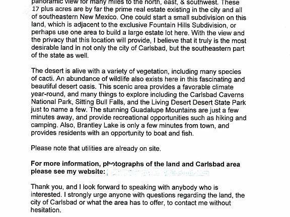 Fountain Hills Development Company is the owner of this approved Unit #11 Subdivision located in Carlsbad, NM which consists of 17 acres. It is located in the heart of an exclusive subdivision in this area. Its hilltop elevation and panoramic view plus all of the many other amenities that are currently offered make this a prime subdivision. The entrance to the subdivision is by electronic gate via Christel's Place, which intersects Miehls Dr. The area near the electronic gate is lighted. If a person so chooses, they could use this subdivision as their own large private estate.