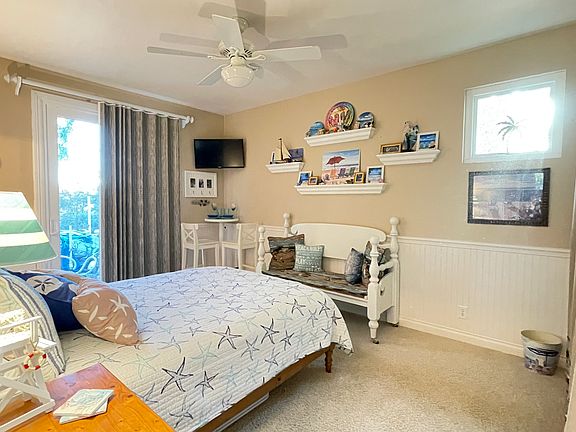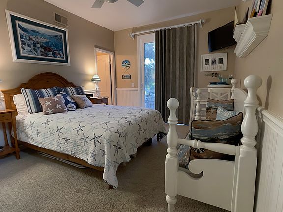 The Room has a queen-size bed, two end tables, a small dining table with two chairs, a TV, and a bench. The closet has plenty of drawers and shelving and a counter with enough room for a coffee pot, microwave etc.