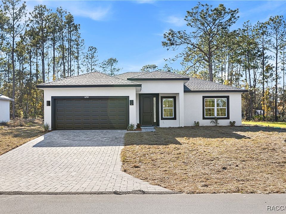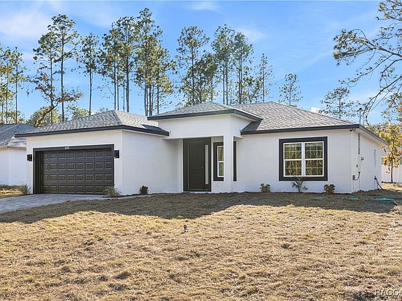 Brand-new house in Citrus Springs! Welcome to this stunning 3-bedroom, 2-bathroom home offering 1,562 sq. ft. of living space and a total of 2,099 sq. ft. under roof. Step inside to an open-concept layout featuring a modern kitchen with a QUARTZ WATERFALL ISLAND, sleek DARK FIXTURES, and a spacious dining and living area great for entertaining. The split-bedroom design offers privacy, with the owner’s suite showcasing a large walk-in closet and a luxurious master bathroom with a DOUBLE SHOWER. Enjoy outdoor living on the COVERED LANAI and the convenience of a PAVER DRIVEWAY leading to the 2-car garage. Located in a peaceful neighborhood near shops, restaurants, and outdoor recreation, this home blends contemporary style with everyday comfort. Additional features include a SMART KEY system and a 2-10 HOME WARRANTY. Don't miss this opportunity—schedule your showing today!