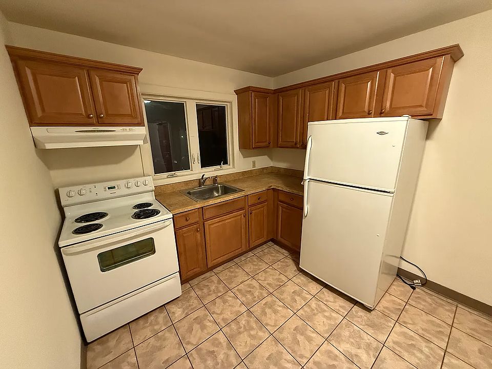 Eat in kitchen with gas stove and fridge, no dishwasher