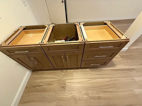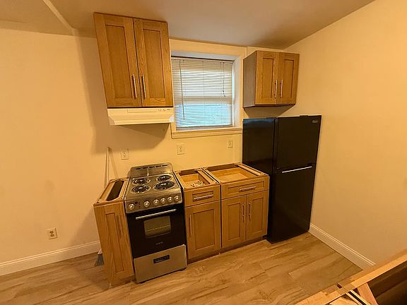 Open floor plan kitchen with new cabinets and granite countertops comes with electric stove and fridge