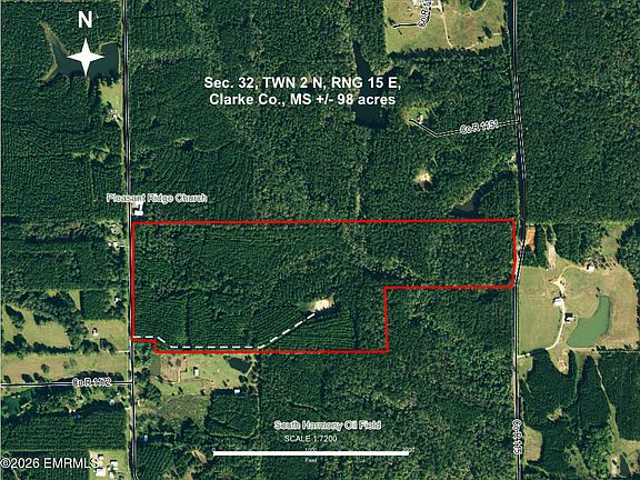 This +/- 98 acre property in Clarke County, MS is approximately 7 miles southwest of Quitman in the Harmony community. With road frontage on county roads 117 and 115, this property has multiple home sites. There is a good access road on the southwest corner of the property that leads to a inactive oil well. 100 % mineral rights are included, The timber consists of +/- 50 acres of 28 year old thinned pines and +/- 48 acres that was site prepped with herbicides and recently replanted. The possibilities for this property are unlimited!