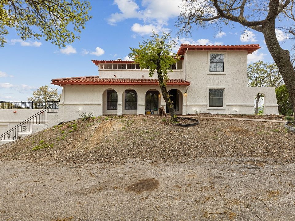 Gorgeous hilltop vistas from this mediterranean home, including views of a deep stock pond loaded with fish, and lush property. The residence has a master down, with another two bedrooms up, plus a large game room area and huge deck. One of the bedrooms upstairs can be converted into two spacious bedrooms. House reinforced with 18 piers. It has recently been painted and ready for your personal touch. What a great opportunity for a fabulous home surrounded by beautiful farm land, AND you can buy more land if you want. There are up to 73 additional acres available that the owner would be willing to divide. You'll enjoy the fabulous views from the pool and deck area and have so many choices for entertaining!