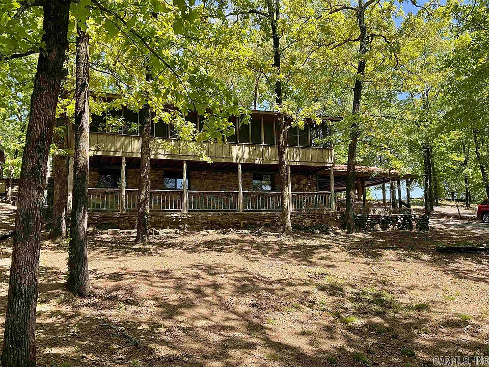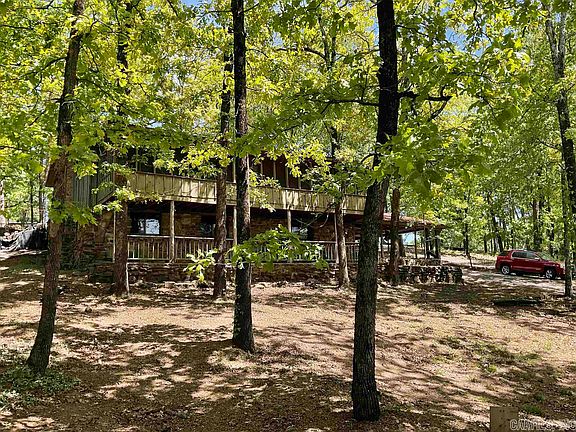 Check out the lakeview from the upper stamped concrete patio with firepit, enviting you to spend some time to relax and enjoy! This spacious rustic home is nestled among the shade trees, and offers plenty of space for lake toys and room to gather with a large open living, kitchen, dining, wood burning fireplace and 2 bedrooms and bath upstair. Basement has 1 bedroom 1 bath and large area for either game room, living or big bunk area, make it fit your needs! Large screend in back porch main level. There is also a large carport and a one car garage with door, great for 4 wheeler and toys. The drive connects to the street (Eddie) above and Choctaw Landing below. Easy entrance and exit. Choctaw dead ends at lake two house past this one. So very close to water. See the list of updates included in Pics.