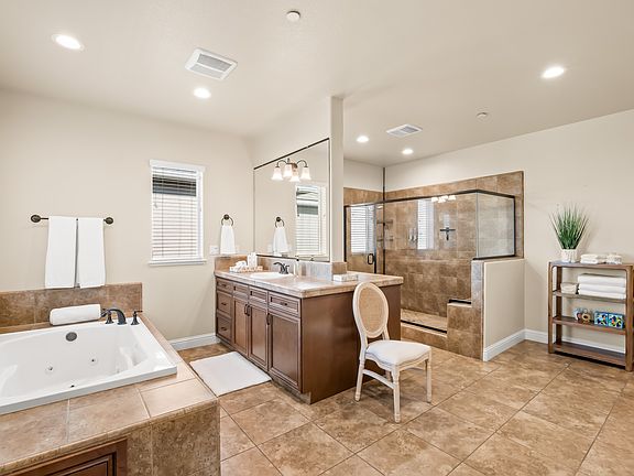 + Upstairs primary suite with an oversized walk-in closet and a spa-inspired ensuite featuring a jetted soaking tub, extra-large walk-shower with built-in bench, and separate vanities for added privacy