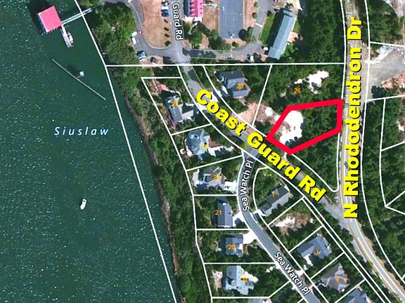 Near the river, beach, and golf course, what a perfect central location! Smell the ocean breezes from the deck you will build on your new house in the trees and then go hit a few balls on the golf course a couple of blocks away. Florence enjoys a temperate climate for the Oregon coast. You will enjoy strolling the shops in Old Town and taking advantage of all that this beach city has to offer! Driving Directions: From Old Town Florence, drive north on the Oregon Coast Hwy. Turn left on 35th St. Turn right on N Rhododendron. Turn left on Coast Guard Rd. The parcel is on the right before Sea Watch Pl. Take the aerial map.