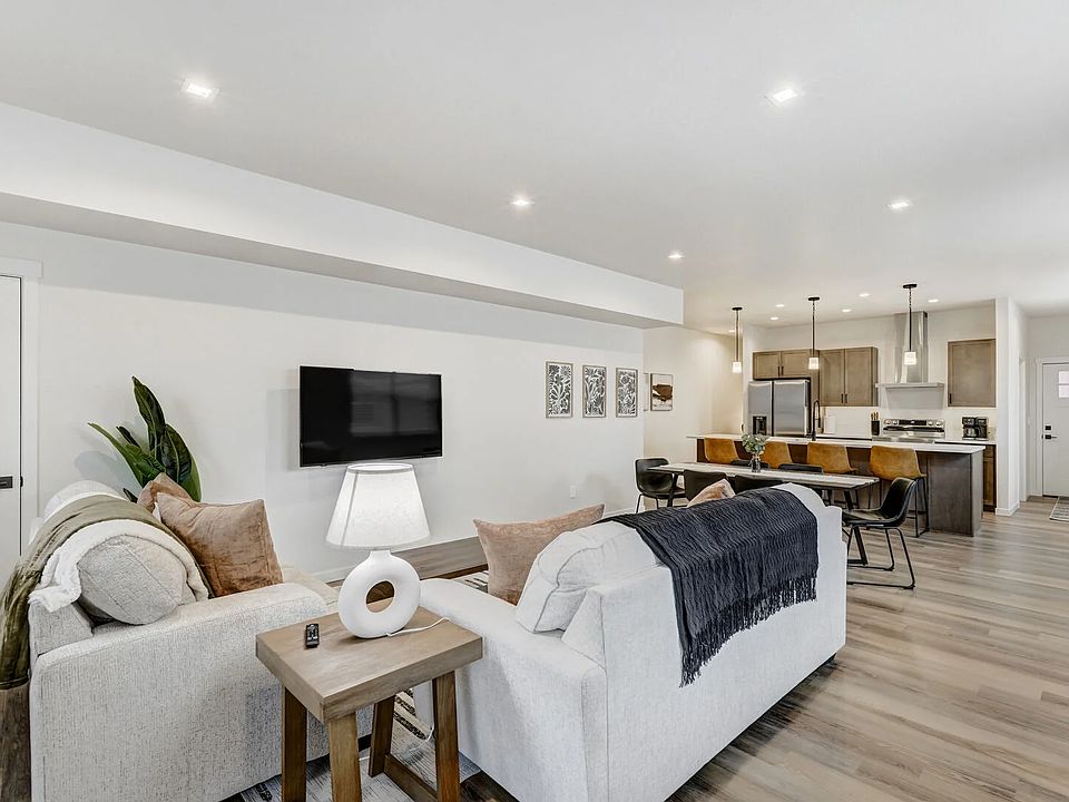 Downstairs, a fully equipped kitchen with stainless steel appliances awaits, offering all the essentials for home-cooked meals. Just off the kitchen, you'll find a dedicated office tucked into the butler pantry, providing a quiet space to work from home. The living room is a cozy retreat, featuring tasteful decor and a large Smart TV for streaming your favorite shows. There's also a convenient half bathroom on this level.