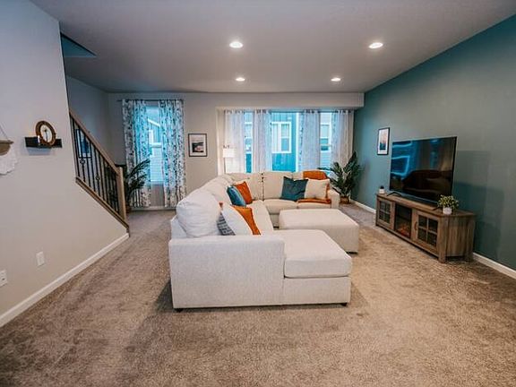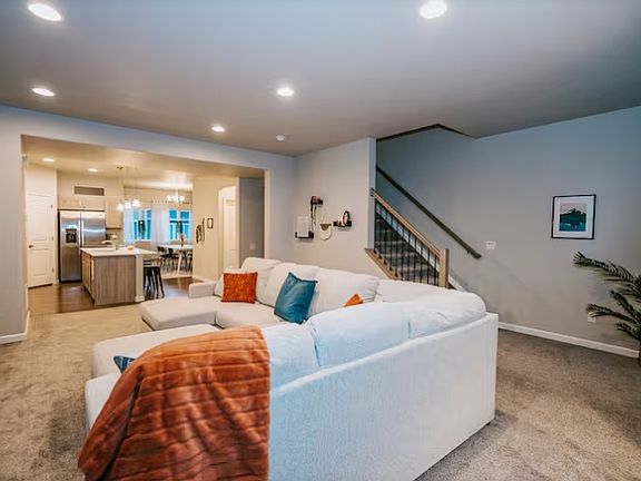 The dining area flows right into the spacious family room, which offers a cozy sectional, large smart TV, and electric fireplace a perfect space to relax or entertain.