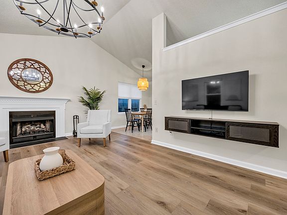 The living room is a perfect gathering spot, featuring a decorative fireplace and a floating TV console, while the dining area comfortably seats six guests. Step outside to enjoy patio furniture with an oversized umbrella, ideal for relaxing or dining al fresco.