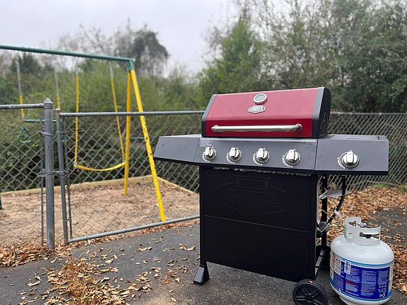 Escape to the expansive backyard where laughter and joy resonate through the air. Here, a vibrant playset awaits the energetic spirits of children, offering hours of amusement amidst the gentle whispers of nature. This private outdoor haven, bordered by a lush tree line, is an idyllic spot for guests to enjoy the simpler pleasures whether it's a round of tag on the grass or a serene afternoon on the swings. As the sun sets, gather around the BBQ grill for an evening of grilling, where every meal is infused with the essence of the outdoors.