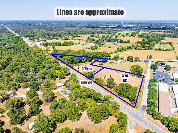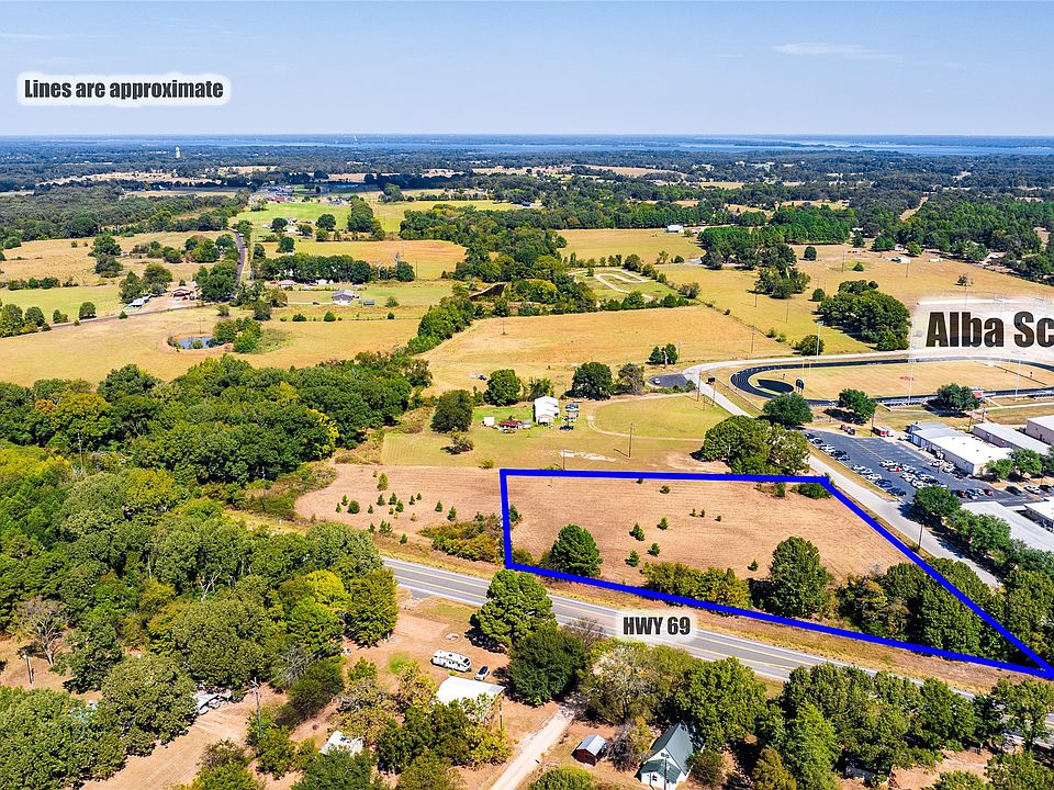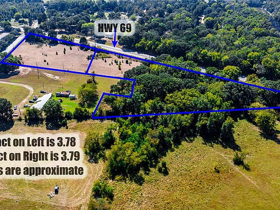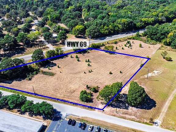 Corner of Hwy 69 & County Road 2377. Prime Commercial Real estate, but it isn't zoned, so you can do whatever you like on the land. 3.7 acres of open land. Another tract next door if you want more land. You can also buy both. Both are for sale for 425000. Both tracts are 3.7 acres, the one with the trees has approximately 772 foot of road frontage, and the one on the corner by the school has road frontage on both sides, but has 689 foot of frontage on Hwy 69.