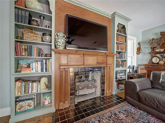 The spacious, covered front porch offers a vantage point for watching the rain or visiting neighbors as they walk their dogs. The lush front lawn is shaded by mature oak trees, creating a welcoming curb appeal.