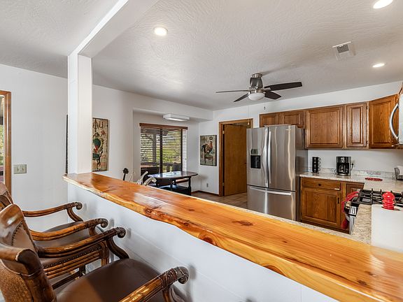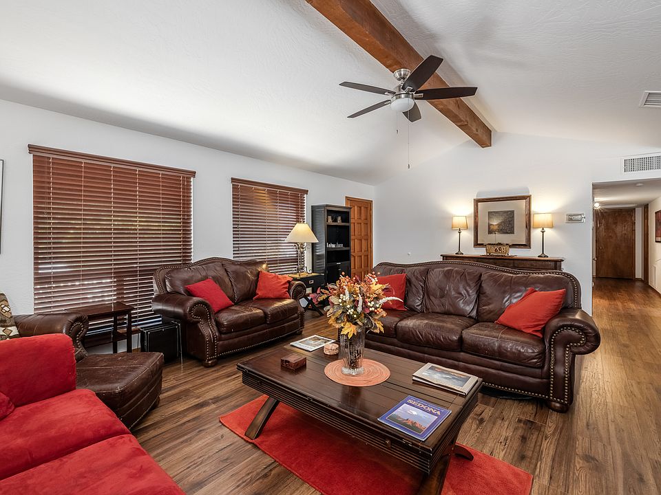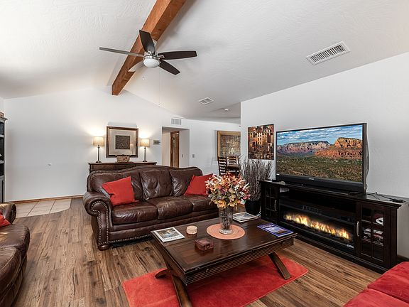 High Beamed Ceilings accentuate the open Floorplan in the Living Room area. A Game Table / Coffee Table extends to Enjoy Sports and Table Games in our Cabinet as well as a Flat Screen TV. A well stocked Gourmet Kitchen complete with Cooking Utensils, Pots & Pans, Dishes and Coffee .. everything needed to enjoy your stay. Large Master with Queen, with a private Ensuite, 1st guest room has a Double Bed and Twin, Flat Screen TV and a Rocking Chair with ottoman and Crib. The 2nd guest room has a Queen Size Bed with a Desk and Flat Screen TV. Relax on the Back Patio and Covered Deck area that looks out to the Sedona Red Rocks and a large private backyard. New "Arizona Room" fully equipped with a Treadmill & Weights, Stationary Bike, Reading Room, Music Room, TV and Game Room.
