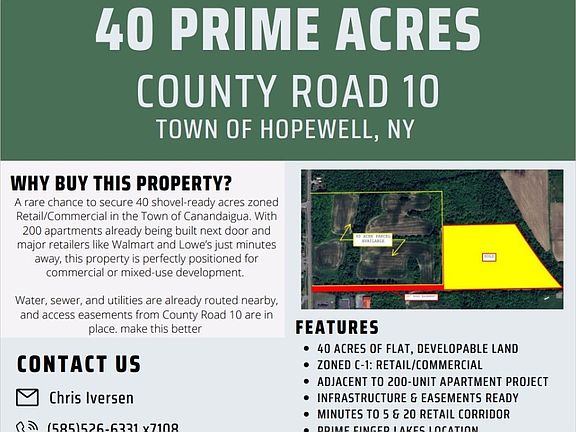 FINGER LAKES APPEAL: Capitalize on the appeal of a prime location just minutes from the vibrant waterfront and recreational opportunities of Canandaigua Lake. This is a strategic investment in one of Upstate New York's most desirable growth corridors. Contact us today to seize this exceptional development opportunity.