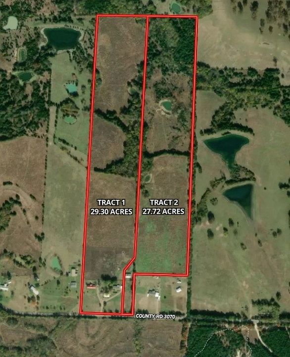 $5000 PER ACRE IS THE OPENING BID FOR THIS PROPERTY SELLING IN A LIVE AUCTION WITH RESERVE ON SATURDAY, OCTOBER 28, 2023 AT 2PM. This is TRACT 2 of the 57.02 acre property that will be offered in 2 separate Tracts in the Auction. Buy either Tract or buy both Tracts. Tract 1 is 29.30 acres with 2 mobile homes and Tract 2 is 27.72 acres with a workshop-barn. There's several stock ponds and plenty of lush fenced with a nice mix of mature trees. Property sells AS IS with no contingencies related to Buyer's ability to attain Funding. Post Sale Inspections or Appraisals do not alter the outcome of the Auction and NO Option Period. 10 percent Buyer's Premium is added to the High Bid at Auction to constitute the Total Contract Price. BP is paid the day of the Auction by Cash or a Personal or Business Check will be accepted with a Bank Letter of Guarantee or other Proof of Funds. Balance due Thursday, December 14, 2023 at Doster Law Group in Denton.