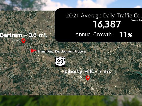 Highly sought-after transitional development land located in the fast-growing area of eastern Burnet County. Located just ~3 mi south and east of Bertram, ~8 mi west of Liberty Hill, ~23 mi west of Georgetown and ~42 mi north of downtown Austin. The property is well drained and gently slopes from north to south. It Includes over 800 feet of frontage on paved County Road 322 (Old Hwy 29). Numerous large oaks and other native trees and grasses cover the property. A 1-D-1 Ag tax appraisal held by a grass lease keeps the property taxes low. Improvements include fencing and water well. This property is ready for immediate development or buy and hold. Three additional properties are available that are contiguous with this property and make a nice assemblage. 1. Bryson Farmhouse – 147 acres shares the West boundary of this property 2. Davidson Property – 10 acres shares the East boundary of this property 3. Highway 29 Commercial – 33.3 acres – connected by the Davidson property
