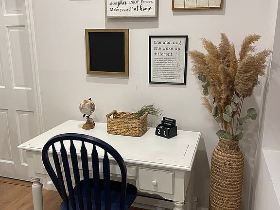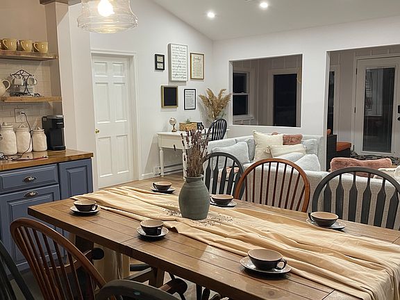 The home offers two queen bedrooms, two full bathrooms, and an additional family room with flexible sleeping space for three (1 full futon and 1 twin bed). The living area includes a comfortable setup suitable for remote work, along with a fully equipped kitchen and inviting dining space.