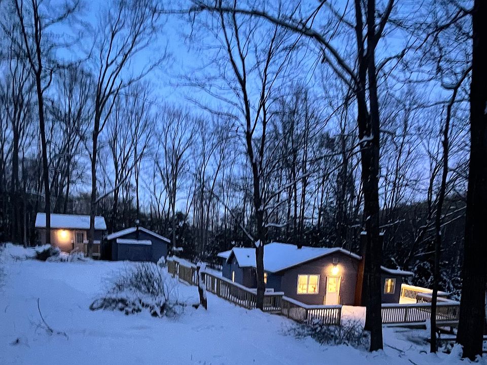 Outdoor amenities include a private deck overlooking the woods and a fire pit for relaxed evenings. Conveniently located near ski resorts, outdoor recreation, and the casino, while still offering privacy and quiet.