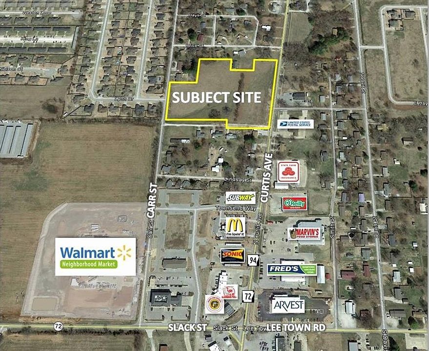 Commercial land for sale. Across from post office in heart of Pea Ridge. 6,800 CPD. Zoned C-3. Frontage on S. Curtis and Carr Street. Owner will consider subdividing.