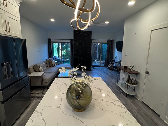 Open-concept living, dining, and kitchen with updated flooring, sleek black accents, and statement modern lighting that sets a boutique-hotel vibe.