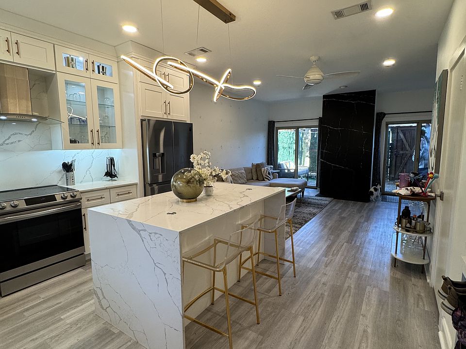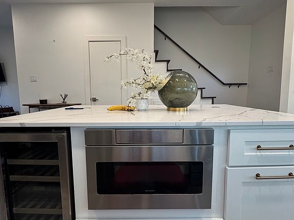 Fully remodeled kitchen featuring quartz waterfall island, stainless steel appliances, custom cabinetry, wine fridge, and bar seating that is perfect for entertaining.