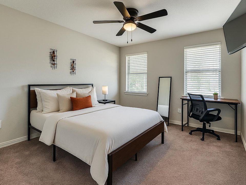 Fully furnished rooms with essentials (bed, desk, chair, TV, closet)