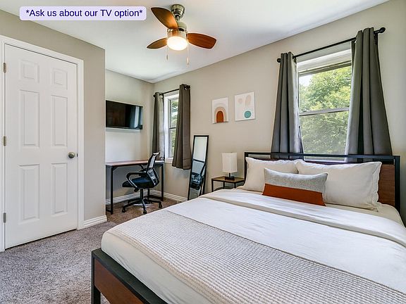 Fully furnished rooms with essentials (bed, desk, chair, TV, closet)