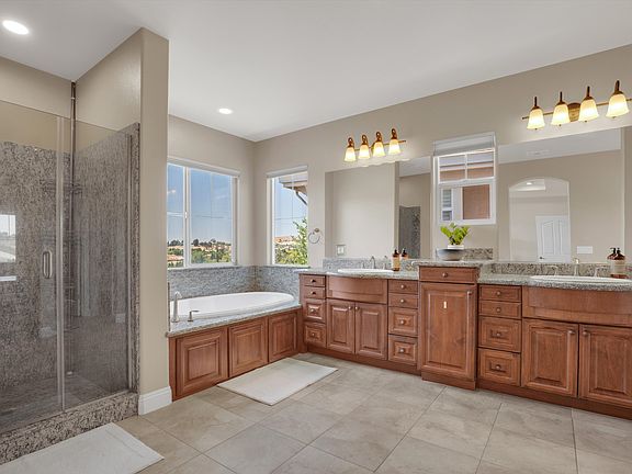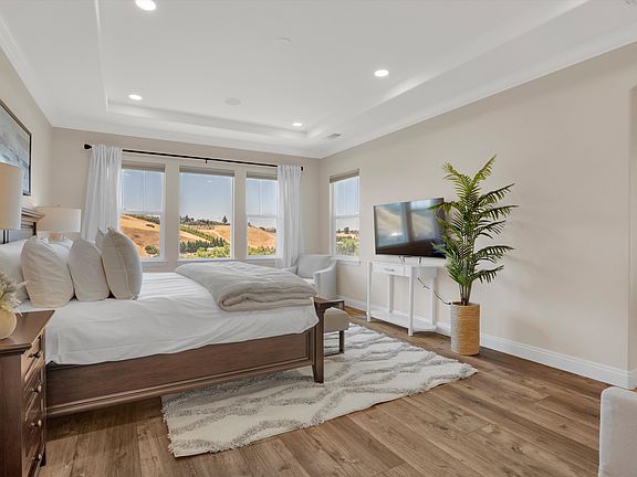 + A primary bedroom with hillside views, walk-in closet, spa-like jetted bathtub & LG TV