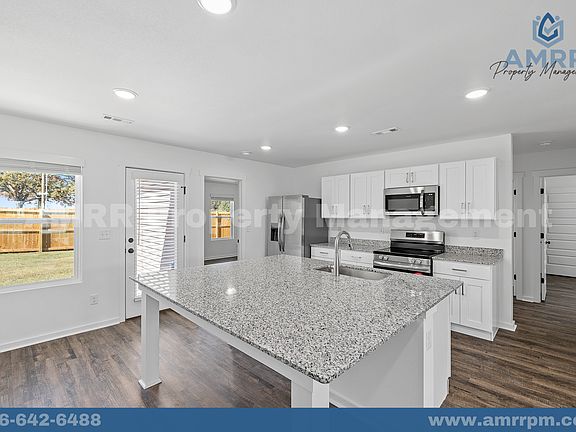 The kitchen features a stove, microwave, dishwasher, custom cabinets, a stainless steel fridge, and vinyl flooring that extends throughout the home, which means NO carpet whatsoever. The sizable backyard includes a relaxing covered patio and a grass yard.