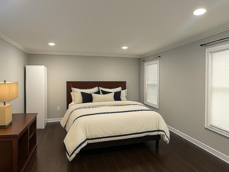 Large bedroom with engineer hardwood floors, two night stands and a work desk.
