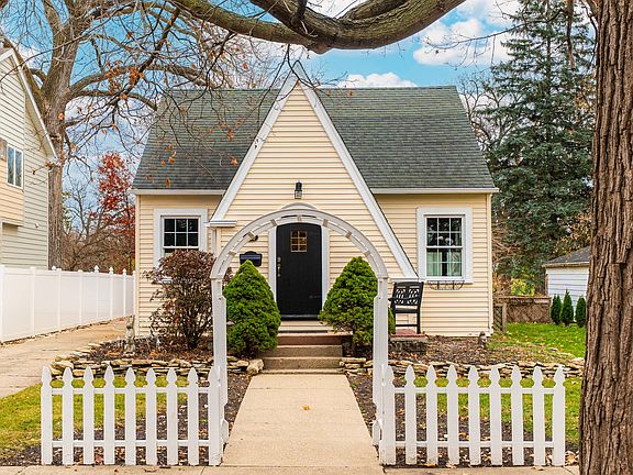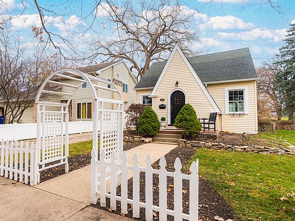 You'll be captivated by the eye-catching architecture of this charming "Storybook Home," featuring a quaint arched entry door that opens to a spacious living room and formal dining room with hardwood floors and abundant natural light. Down the hallway, find two cheerful bedrooms, a lovely full bath, a convenient laundry chute, and a Primary Bedroom with a vaulted ceiling and character-filled windows. The step-save galley kitchen just off the dining room offers both form, function and comfort to this one-story beauty. The unfinished basement includes a second bathroom, laundry area, utilities, and extra storage. Outside, enjoy a composite deck with pergola overhead, surrounded by lush vines and a private, fenced yard that backs to schoolyard green space. A playhouse/storage area and oversized garage add even more appeal. Updates include: water heater (2025), refrigerator (2023), furnace, central air & humidifier (2021), washer (2023) dryer (2022), roof (2006), and replacement windows. Extras included: vintage safe, workbenches, shelving, pantry and storage units. Full of warmth, whimsy, and thoughtful details, this delightful home offers a perfect escape from the ordinary and a truly happy ending to your house-hunting story!