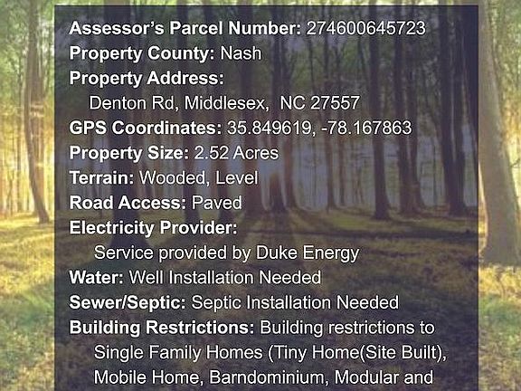 2.52 acres in Middlesex, NC *MOBILE HOME, TINY HOME, OR BARNDOMINIUM APPROVED* 10% Off Market Value! Discounted Cash Price: $34,900 Quiet, wooded lot located in Middlesex, NC. This private lot is away from the high speed of city living while being within an hour of Raleigh, Chapel Hill, Wake Forest, or Rocky Mount. The property comes with very few zoning restrictions allowing for many home construction possibilities. This property is zoned A-1 allowing for the build of a site built tiny home, modular, mobile home, barndominium, or stick built home. Enjoy the peace and serenity of country living on this Nash County property! Property Details Address: Denton Rd, Middlesex, NC 27557 County: Nash APN (Assessor’s Parcel Number): 274600645723 GPS Coordinates to locate property: 35.849619, -78.167863 Lot size: 2.52 Acres Approx. Dimensions: 114ft X 1004ft X 108ft X 1041ft Building Restrictions: Building restrictions to Single Family Homes (Tiny Home(Site Built), Mobile Home, Barndominium, Modular and Stick Built Home) Sewer/Septic: Septic Installation Needed Water: Well Installation Needed Electricity: Service provided by Duke Energy Annual Property Tax: $165.87 Food 9 minutes away Grocery 12 minutes away Pharmacy 10 minutes away Hospital 24 minutes away Horseshoe Farm Nature Preserve 33 minute drive Go Ape Zipline & Adventure Park 43 minute drive Falls Lake State Recreation Area 46 minute drive Buckhorn Lake 20 minute drive Wilson 28 minute drive Rocky Mount 31 minute drive Raleigh 36 minute drive Make this property YOURS for a cash discounted price of $34,900! We are motivated to sell - All cash offers will be considered! Message, call, text or email us today to get started. We make it super easy for you! 980-277-1125 discountedlanddeals@gmail.com Visit our Facebook page at www.facebook.com/discountedlanddeals to view all available properties! **As with any purchase of land, Buyer is responsible for verifying all information with the city/county as to what can and cannot be done with the property and confirm availability of any utilities/services for the property. Seller makes no warranties or representations about the land.