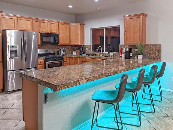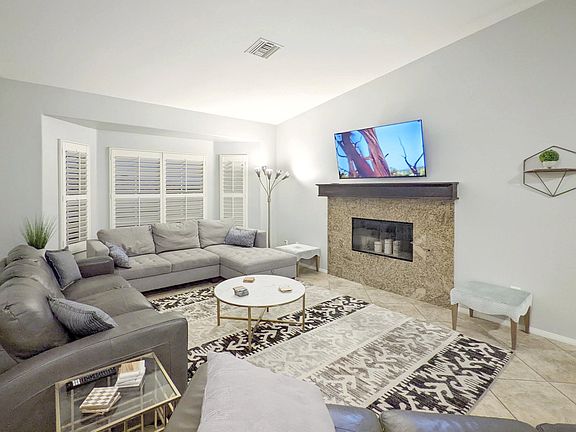 (Please message to discuss dates before applying thru Zillow). Available May 2025-onward. Short, Mid, or Long Term ok. **I can't do sublets**. - Private pool, hot tub, big yard, outdoor BBQ and wet bar, 4 large bedrooms, 2 full baths. Freshly updated nice home! 2 fridges, 2 laundry dryers for ultimate convenience! Solar panels for low electric bills. Full size garage and large driveway, back yard, huge kitchen and dining room. Can be fully furnished - if needed - including housewares and TVs, you can move right in! Tile and wood floors, beautiful master bathroom suite with private patio doors. High ceilings with fans in every room, great lighting, with loungers and patio furniture in the shaded back yard. Wonderful mountain views from the pool and spa. Kitchen has pass-though window to the outdoor kitchenette for indoor-outdoor living. 4th bedroom is oversized with its own entry to the front patio for a semi-private unit, office, meeting space for clients, or work-from-home space. 3 smart tv's already mounted, huge walk-in closet, all stainless appliances! In Desert Hot Springs, centrally located 15 minutes to Palm Springs and the rest of Coachella Valley in a nice residential neighborhood with no traffic, no HOA fees and flexible lease terms. Rent price variable based on term and whether you want landscaping and pool maintenance fully included or some DIY. Monthly, 6 mo, annual or flexible lease terms, please ask. Trash and wifi included, renter pays all other utilities. House has solar so power bills are low. Landscape service and pool maintenance can included or tenant can perform, to be discussed, depending on tenant's desire and ability.