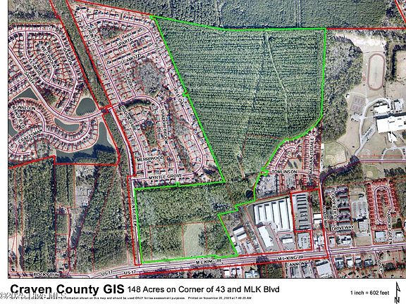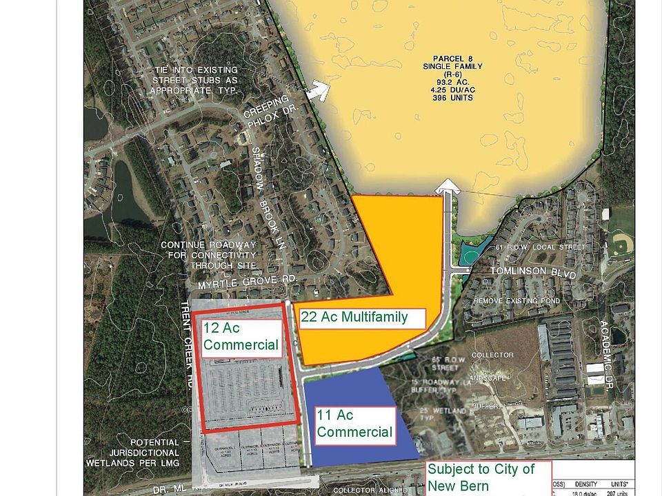 90 Acres of Land with City of New Bern Water and Sewer available & at the site. Land is Zoned R-6 in city ETJ which allows for high density single and multifamily development. Preliminary wetland studies (PJD) in photos and attached in Documents. This PJD was done prior to 2023 Sackett case, which limits jurisdiction, and shows no wetlands on the 90 acres. Seller is a NC Licensed real estate broker. Numerous existing access points with main access off of MLK/Hwy 17 Business can be constructed by developer near existing billboard or will be build by adjacent MF or Commercial developments. Land is located between New Bern High & New Hwy 43 Connector which ties into Hwy 70 & about 1 mile from Harris Teeter shopping center. Acreage is approximate & buyer will need a new survey as 90 acres is part of 150 acres of SF, MF & Commercial. Buyer can purchase in multiple take downs. Seller is not a developer & will make no improvements. See all Documents & Disclosures. Clean Phase 1, PJD & Traffic Study Available.
