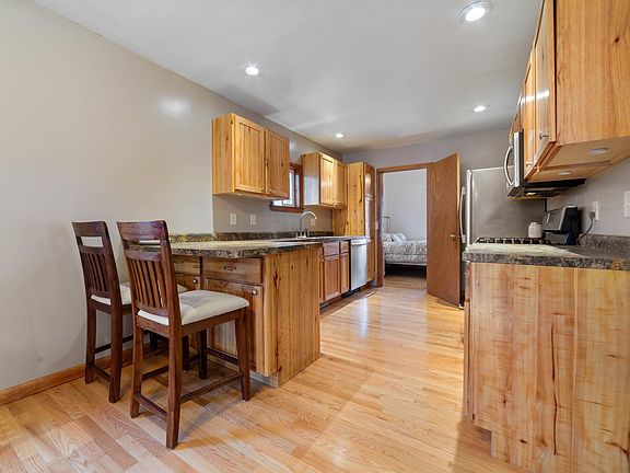 - Description: An abundance of Knotty Pine cabinets, breakfast bar, all stainless steel appliances, gas stove