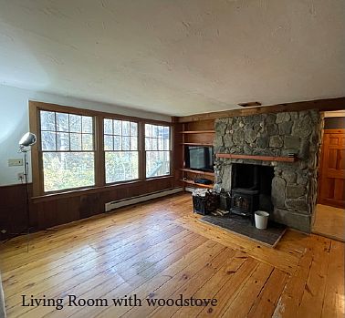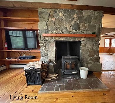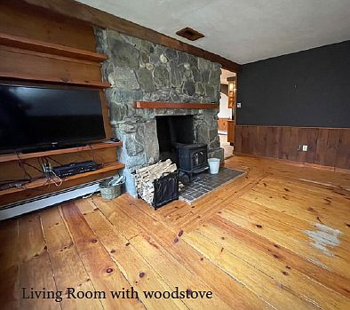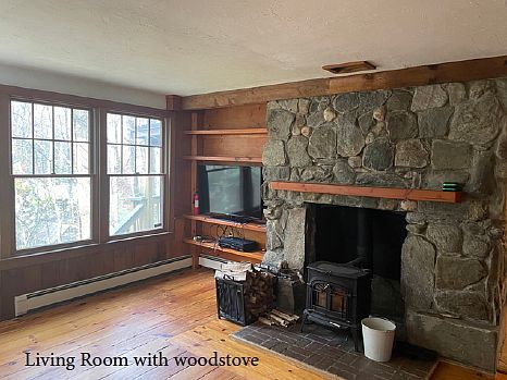 Warm, cottage-style interior Enjoy wood floors, a stone fireplace with a wood stove, and a bright, cherry kitchen with new appliances and an open dining area.
