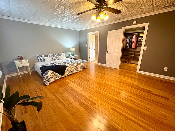 Electric fireplace in primary bedroom and large walk in closet with built ins.