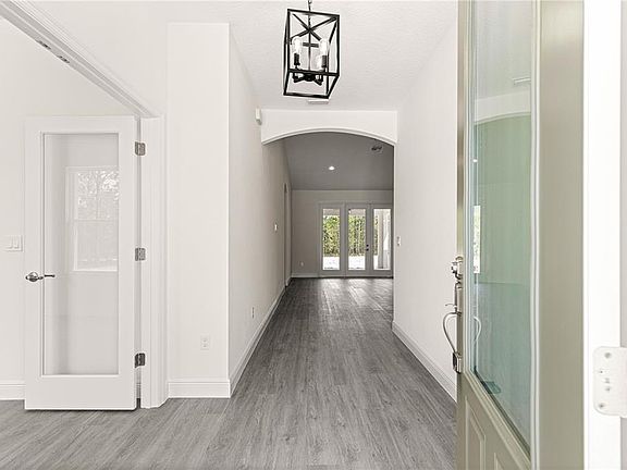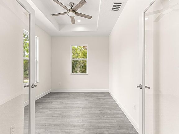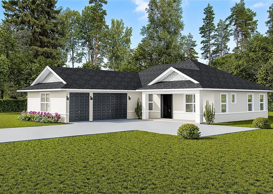 Pre-Construction. To be built. Discover The Tranquility—a beautifully designed PRE-CONSTRUCTION 3-bedroom, 2.5-bath 3-CAR GARAGE home + office with over 2,300 sq. ft. of living space. Thoughtfully crafted with quality finishes and modern comforts, this home offers both style and functionality. The open concept living and dining area features vaulted ceilings and expansive views of the covered OVERSIZED LANAI, creating an inviting space to relax or entertain. The chef’s kitchen includes granite countertops, stainless steel appliances, 42” soft-close cabinetry, a center island, pot filler, range hood and tiled backsplash. The primary suite is a private retreat with tray ceilings, dual closets, and a spa-inspired bathroom featuring dual granite vanities, a SOAKING TUB and a walk-in tiled shower. A barn door separates the second and third bedrooms with a shared full bath for added privacy. Additional highlights include a MUDROOM with coffee/wine bar, walk-in pantry, and HALF BATH, a laundry room with folding station, and an OFFICE with French doors—perfect for a study, den, or craft space. Enjoy peaceful evenings on your FRONT PORCH overlooking your front yard. Other features: well water with filtration system and a partially glass front door for added curb appeal. This home is available for pre-construction, giving you the opportunity to choose your preferred finishes and details from the builder's selections. The builder works with cash held in escrow (paid in construction stages) or construction-to-perm loan (VA or Conventional) financing with incentives through the builders preferred lender. Photos show a previous sold home and reflect the following buyer paid upgrades -stone veneer accents at the front elevation and luxury vinyl plank flooring in the bedrooms.