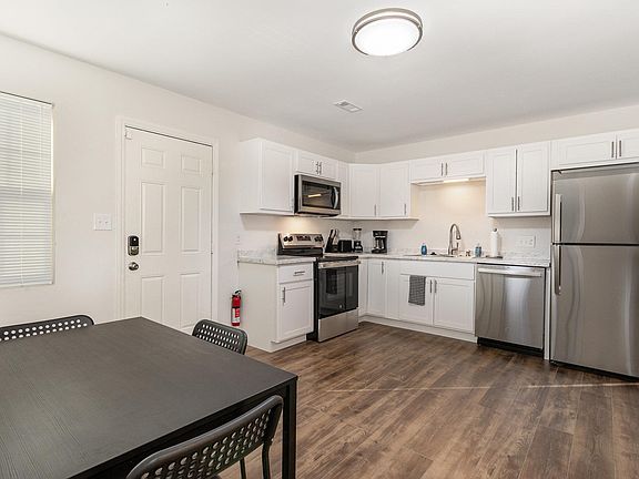 The kitchen comes equipped with a fridge, sink, oven, stovetop, microwave, dishwasher as well as garbage disposal.