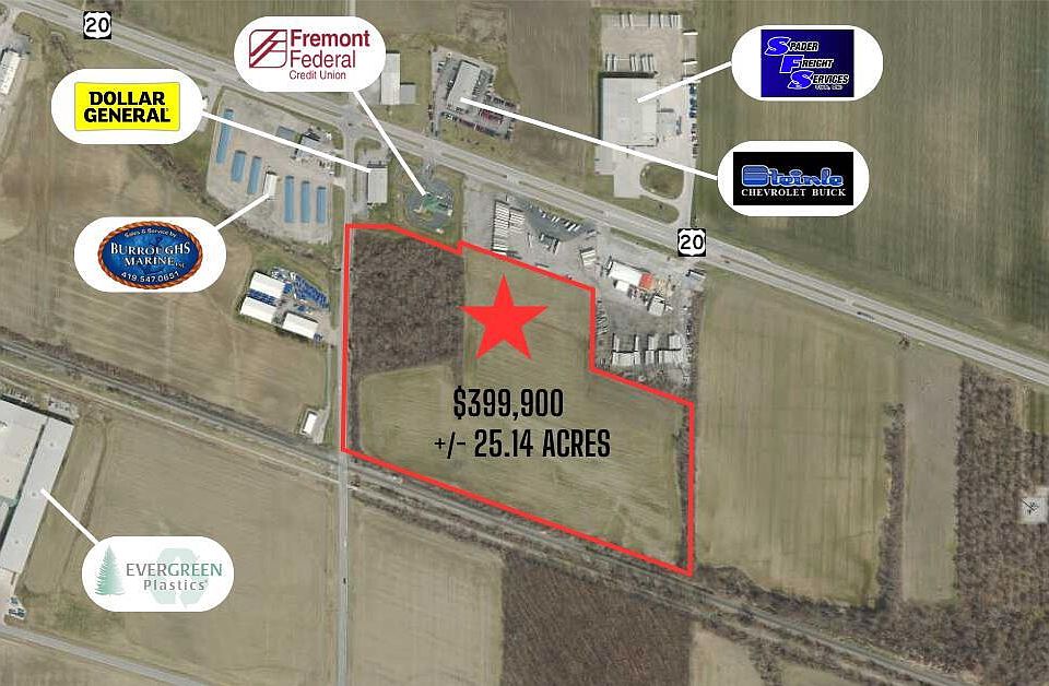 $399,900 buys this 25-acre commercial site in Clyde, OH. The site is well located near the historic US Route 20 corridor and perfectly located just east of Clyde and just west of Bellevue. OH. The property offers just over 25 acres of land zoned C-2 (General Commercial) and allows for a broad spectrum of uses. There is frontage along Durnwald Road/CR 260 as well a 30' easement agreement to US 20 through the property owned by Fremont Federal Credit Union. There are nearly 21 acres of land used for production, benefitting from CAUV taxation. The balance of the property is wooded or used as ROW (Right-of-Way). Nearby users/operators include: Fremont Federal Credit Union, Dollar General, Steinle Chevrolet Buick, Rush Repairs & Recovery and NOMS Healthcare.