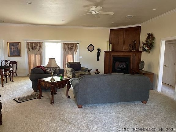 Sitting on 4.5 Acres m/l, Spacious Living w/fireplace, Dining Area, Kitchen & breakfast nook w/hardwood floors, tiled countertops, stainless appliances and breakfast bar. Master Suite w/full bath, whirlpool tub & shower, also includes a walk in closet. The other side of the house has 2 nice size guest bedrooms & guest bath. Off the living area is a Sun Room where you can take in the pretty view. Laundry Room, 1/2 bath & Safe Room. 2 Car Garage, Pond, and a Water Well used for garden & Livestock.