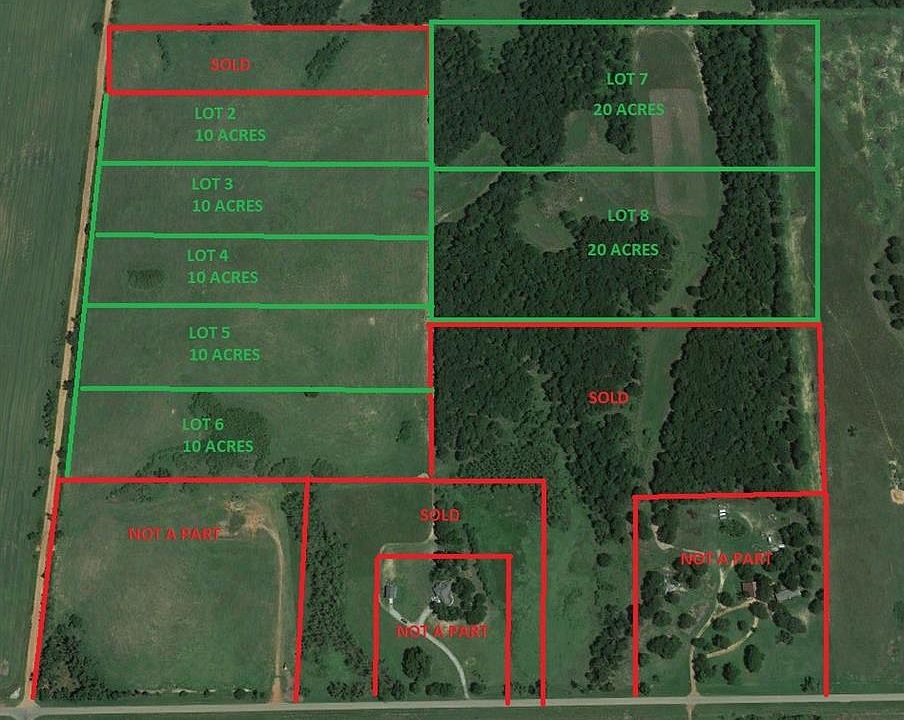 Property is split in 10 acre tracts which run along the west dirt road and are approximately 330 ft by 1323. Topography is rolling hills, pasture land. Electricity is at the road and serviced by Cimarron electric. Buyer to install water well and septic. Seller willing to carry the note.