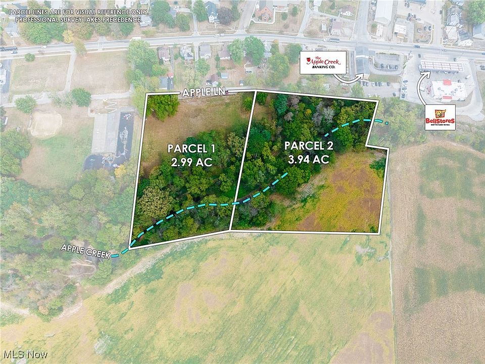 Parcel 2: 3.9-acre parcel with frontage on Apple Lane. This mostly wooded property lies within the FEMA floodplain and features a notable stand of walnut trees along the creek, adding both natural beauty and potential timber value.