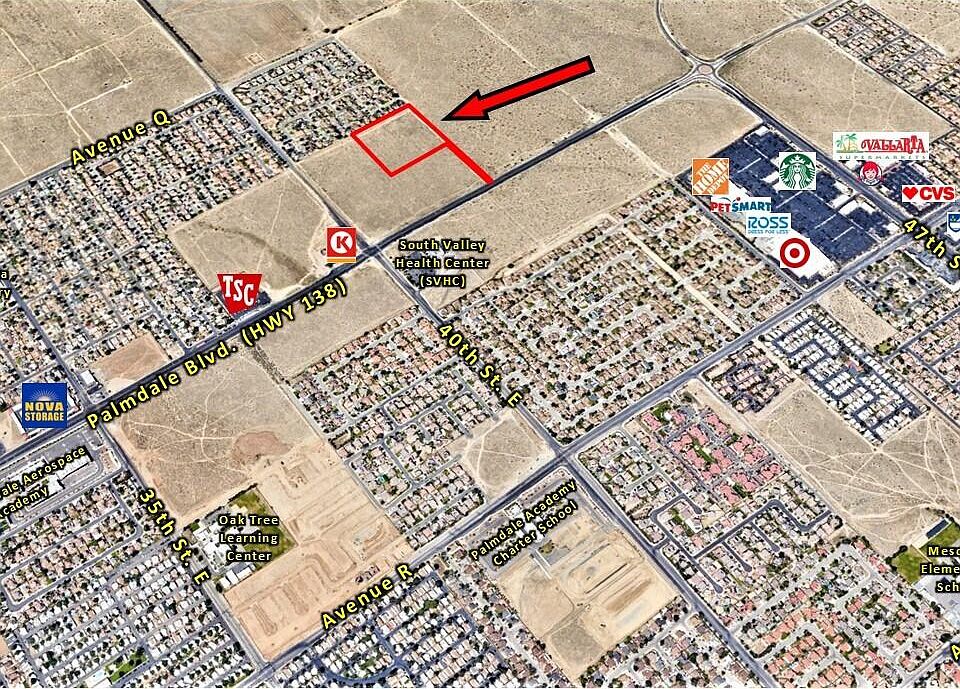 Prime multi-family development site! This site fronts on Palmdale Blvd. (HWY 138) which boasts an ATD of 20,000 - 29,999! Palmdale Blvd. (HWY 138) continues to be transformed into a booming corridor with new retail development of Circle K & Tractor Supply, the opening of the Antelope Valley College Palmdale Center and the prestigious Palmdale Aerospace Academy charter school. Many existing anchored retail shopping centers along Palmdale Blvd. (HWY 138) and 47th St. E with others in the works as the city continues to grow. City of Palmdale just approved the new general plan that will entice and welcome new development and modernize the city by updating the current general plan. Under the new general plan, the property is zoned for multi-family, allowing a density of 10 to 20 units per acre. An investor's dream! This prime future development flag lot offers approximate 10+/- acres of main buildable land with a 20 ... foot wide strip which fronts Palmdale Blvd. (HWY 138); giving possible driveway access. City of Palmdale just approved its new long awaited general plan this year! The new designation is Residential Neighborhood 2 (RN2), allowing a magnitude of multi-family type of development with a density between 10 to 20 units per acre, resulting in a max yield of 200 units for the subject property, according to the new zoning description. Nearby schools include Manzanita Elementary School, The Palmdale Aerospace Academy, Oak Tree Learning Center, Palmdale Academy Charter School & Mesquite Elementary School! Other nearby amenities include a number of anchored shopping centers along Palmdale Blvd. (HWY 138) and 47th St. E, Tractor Supply, Circle K, and South Valley Health Center (SVHC)! Within walking distance to Antelope Valley Transit Authority (AVTA) bus stops, and both the Palmdale Metro Link station and convenient freeway access, are just minutes away!
