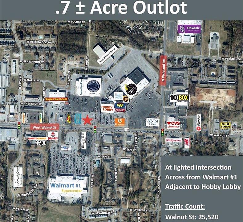 +/- .7 Acre at lighted intersection on the corner of Walnut and 21st St Across from Walmart #1 Adjacent to Hobby Lobby. Walnut Traffic Count 25,500. Build-to-Suit available.