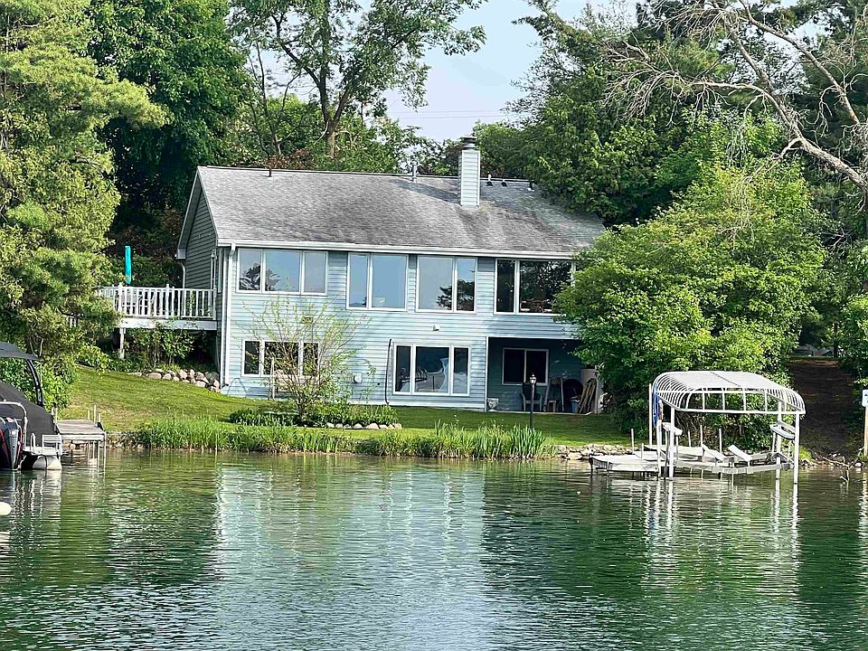 Sandy frontage and sunsets on McCrossen Lake of the Waupaca Chain 'O Lakes! Level lot to lake from walk-out lower level family room. Killer views into Round Lake and all the way to Rainbow Lake. Primary bedroom has private bath and WIC. Main level features fantastic views, a sunroom and access to the deck. Lower level has access to a small covered patio. The garage is insulated. Partially fenced yard. Docks and boatlift included. Lower level bedroom and full bath with laundry plus a large storage room.