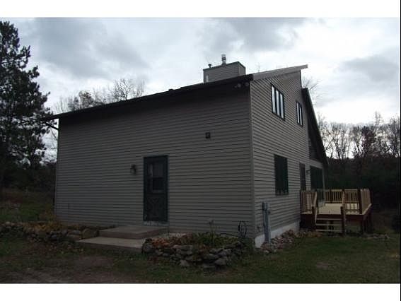 Secluded location for this contemporary home on 5 plus acres. Bank owned. Great room with vaulted ceiling to spiral stairs to upper level walkway. Gas log fireplace. Main floor laundry. Lower level is walkout with toilet and jetted tub framed to finish. Newer roof, newer deck. Two car garage with workshop. Needs flooring and window repair.