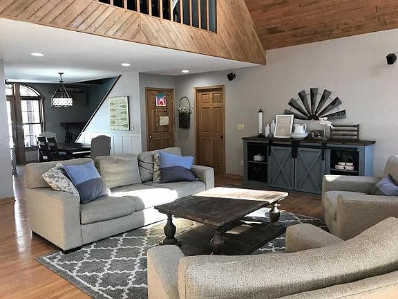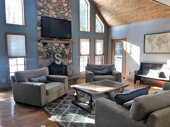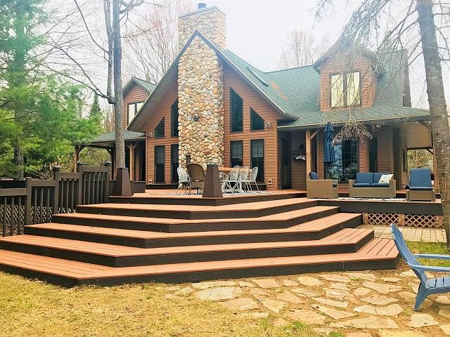 BIRCH & ELEANOR LAKE HOME - Quality and well maintained 4 Bedroom, 3 bathroom home located on the serene and private 181 acre Birch Lake which adjoins private 29 acre Eleanore Lake. This maintenance free cedar look vinyl sided home offers 2400 sq. ft. of living space and features oak flooring, high cathedral ceilings, kitchen with quartz counter tops, new appliances, main level laundry, large master bathroom with Jacuzzi and large fieldstone fireplace with pellet stove. The home is surrounded by a wraparound deck with covered porch, huge sundeck and a hot tub. For your storage needs there is a 2.5 garage and 3 car detached garage. All located on a private, well landscaped lot with 200' sand frontage and southern exposure. Close to town! Schedule your private showing today!