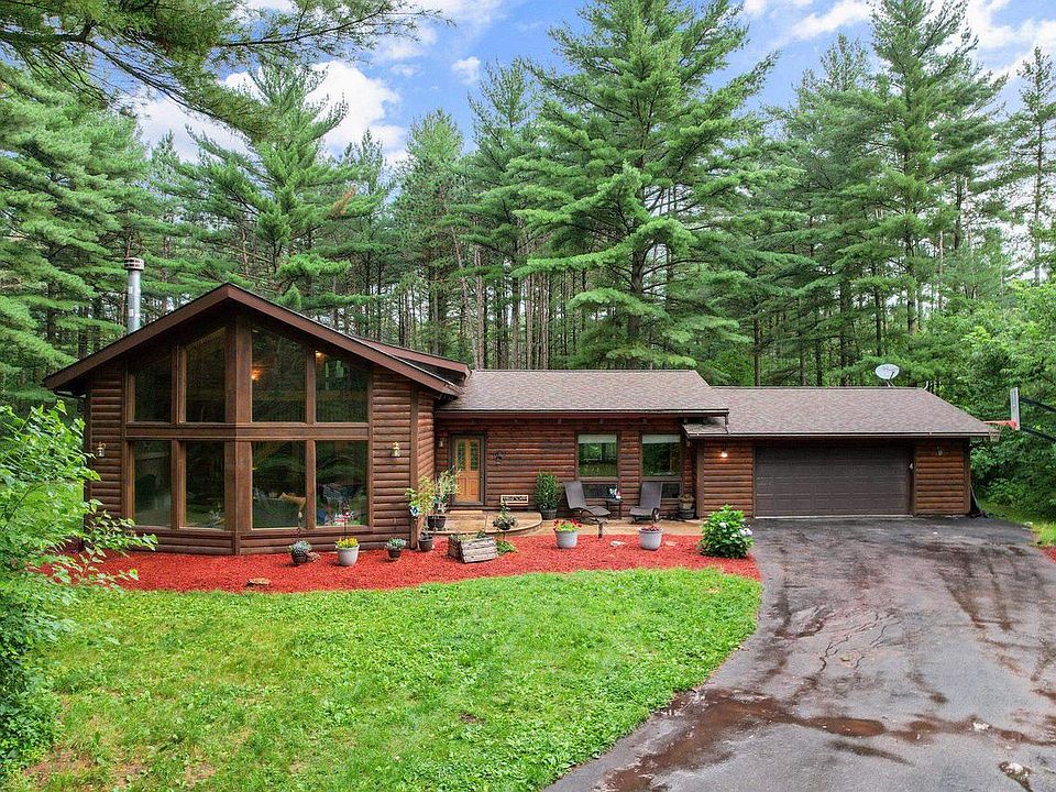 Nestled north of the WI River corridor on 2.24 acres lies this gorgeous timber-framed, log-style home w/soaring ceilings & expansive windows. Timeless, rustic charm meets modern amenities w/a smart layout & appealing design. 2 car garage opens to oversize kitchen & dining area w/vaulted ceilings & space for a living area, hardwood floors, lots of cabinets & counter space, & glass door to the back deck. The main floor also has 2 bedrooms, a full bath & living room featuring south facing, floor to ceiling windows & stone fireplace. Upstairs is a primary suite sanctuary & small loft area. The lower level offers a 4th bedroom, recently refinished rec room, laundry, & a rough in for a 3rd full bath. Access the back of the property via Brace Rd. Room to add garage/workshop? Fiber optic internet!